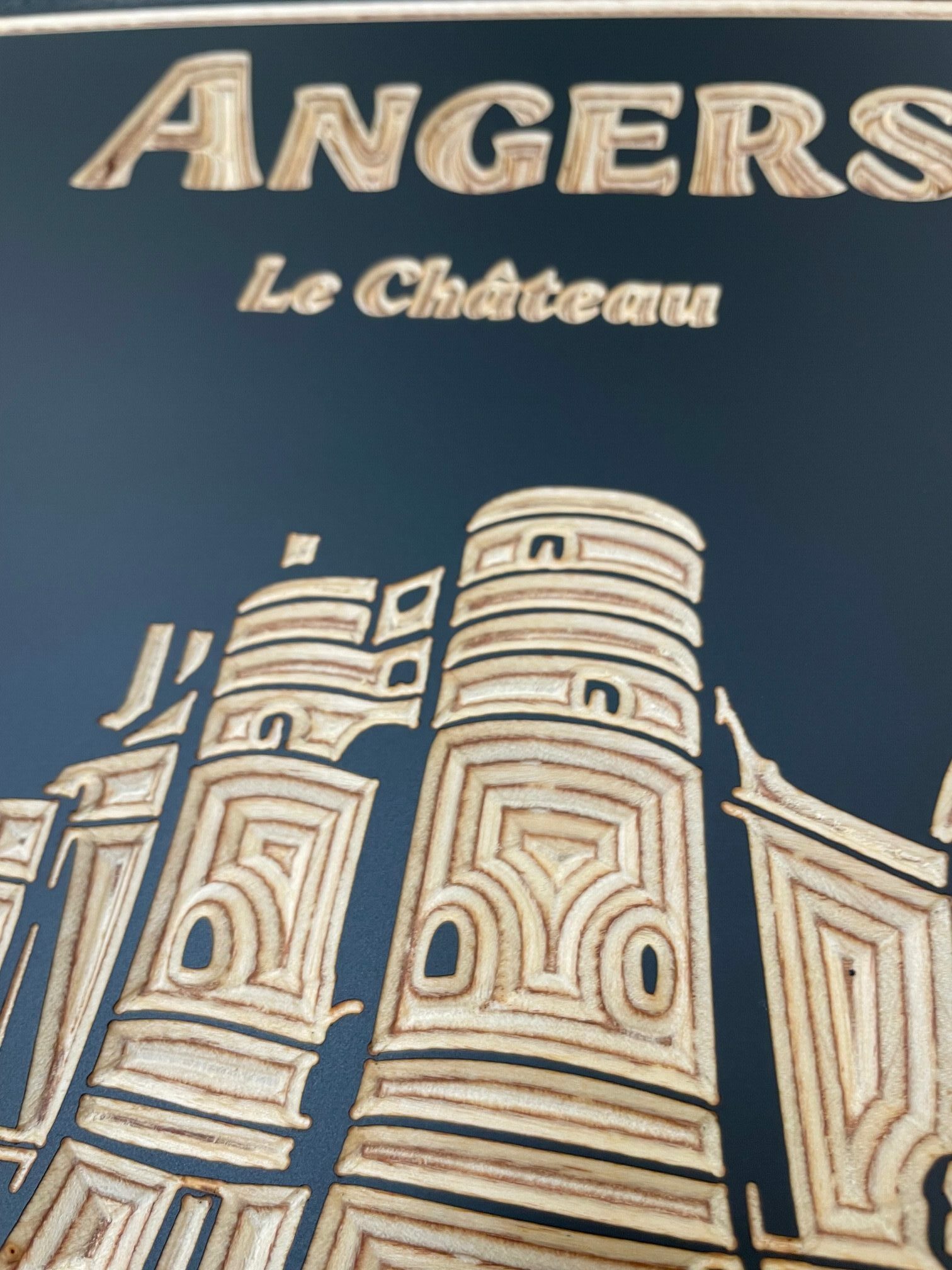 Gravure sur bois bouleau sur fond noir mat représentant le château d’Angers. Taille petit.