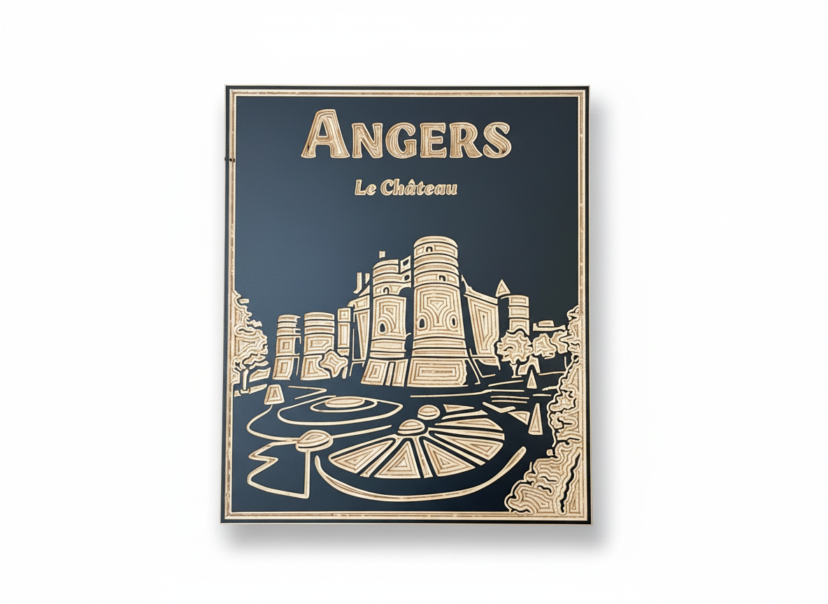 Château d’Angers — Force et mémoire. Ce tableau met en lumière la puissance défensive et l’histoire du château, gravé sur bois bouleau noir mat. Le relief du bois accentue les remparts et la structure monumentale, offrant une œuvre à la fois graphique et chargée de sens. A poser sans système de fixation.