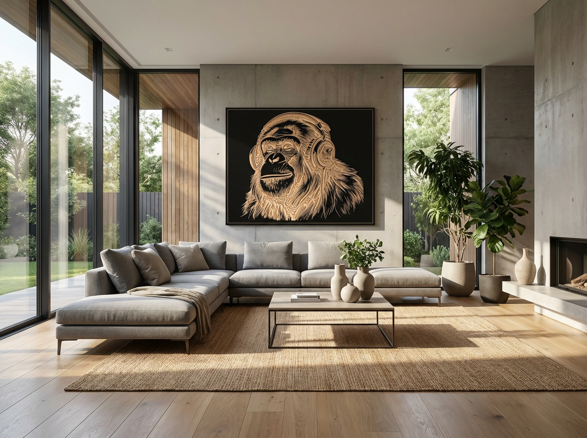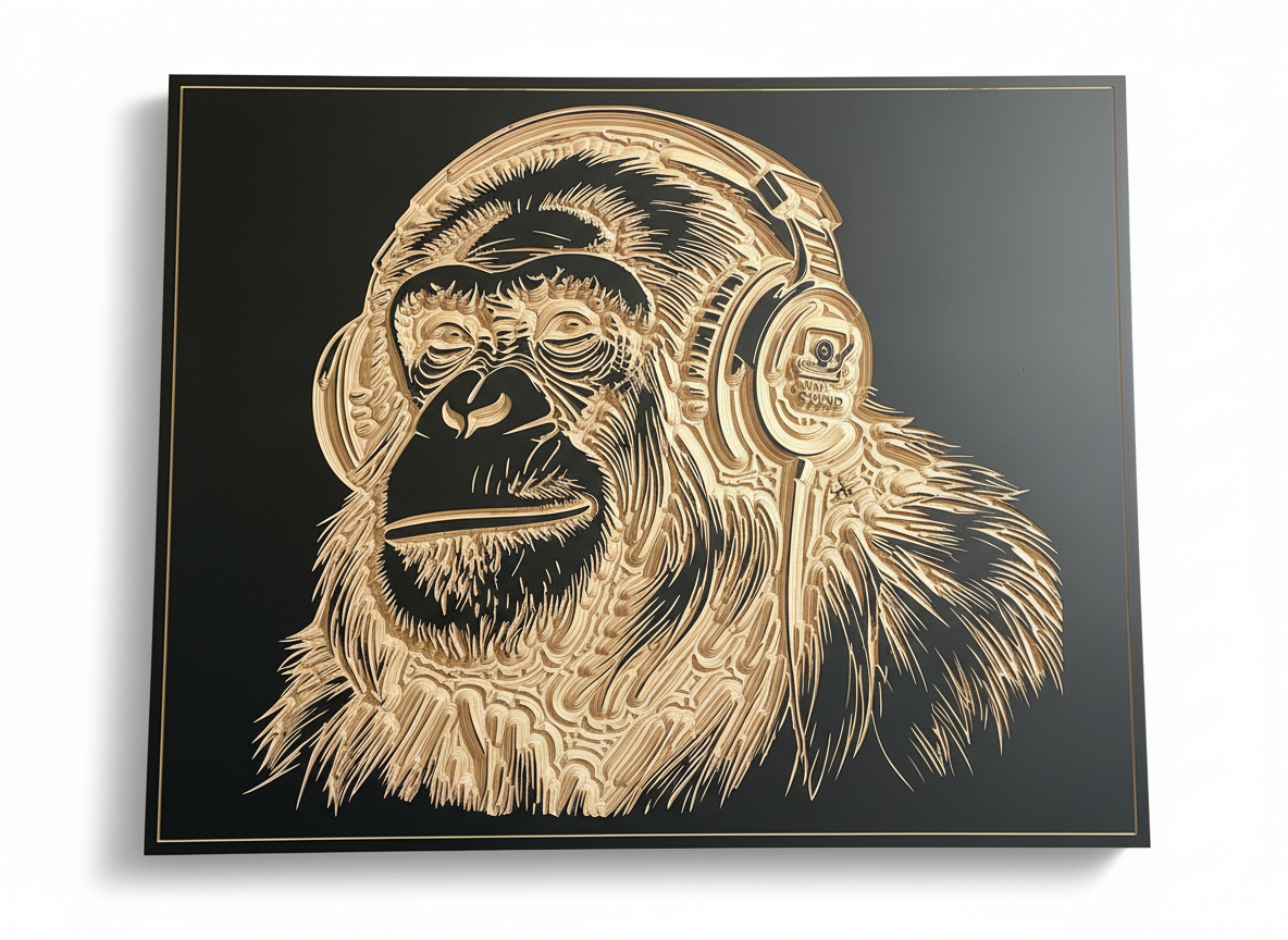 Tableau Sonore JUNGLE – Gorille en gravure sur bois, fond noir – ENCEINTE de 20 à 200 watts