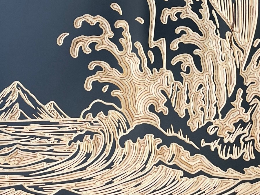 Cette scène spectaculaire capture l’instant où la baleine surgit de l’océan, symbole de force tranquille et d’immensité. La gravure sur bois bouleau noir mat révèle les mouvements de l’eau, l’énergie du saut et la finesse des détails marins avec profondeur et contraste. Livré avec son système de fixation.