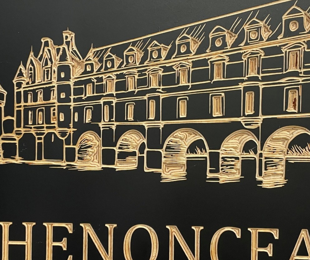 Gravure sur bois bouleau sur fond noir matreprésentant le Château de Chenonceau. Taille Petit.
