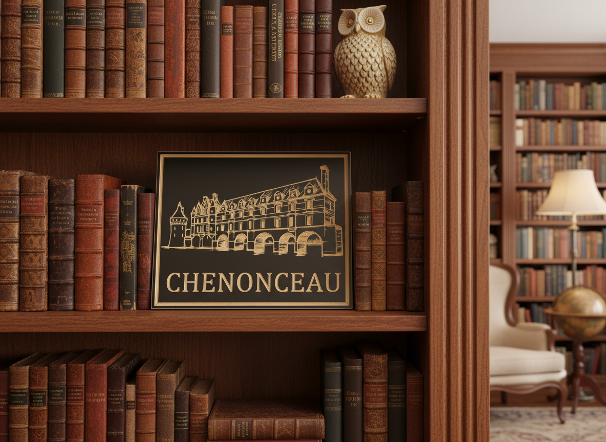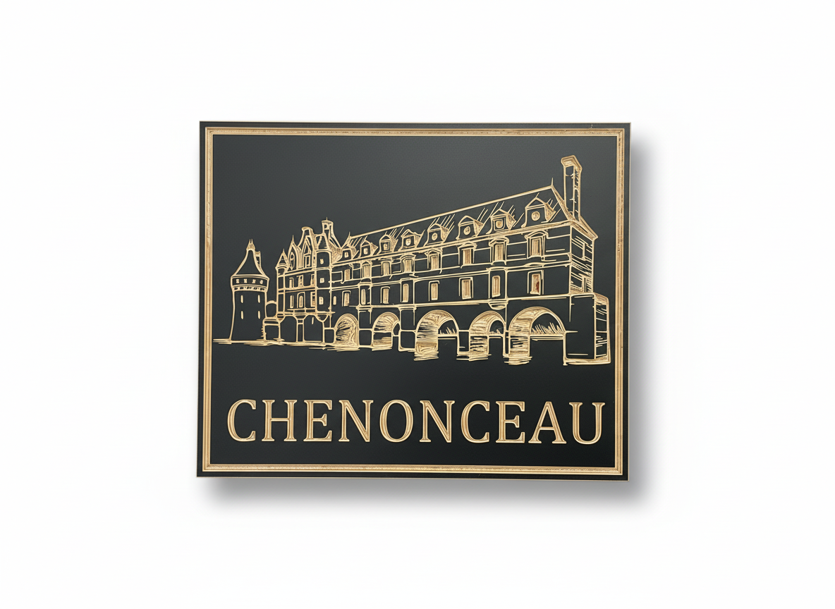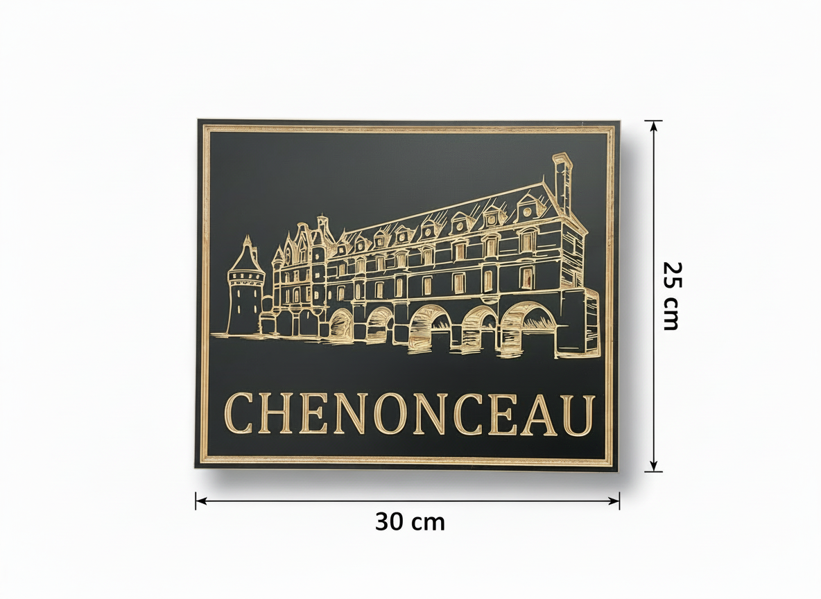 Château de Chenonceau — Élégance et harmonie.  Ce tableau révèle la grâce architecturale du château enjambant le Cher, capturée dans une gravure précise sur bois de bouleau noir mat. Les lignes du bois soulignent la finesse des arches et la symétrie emblématique du monument, créant une pièce décorative à la fois raffinée et intemporelle. Une œuvre qui évoque l’art de vivre de la Renaissance et apporte une touche de caractère à votre intérieur. A poser sans système de fixation.