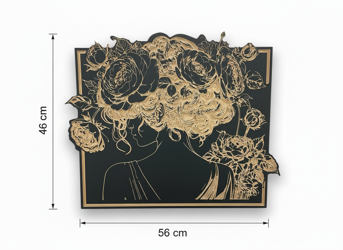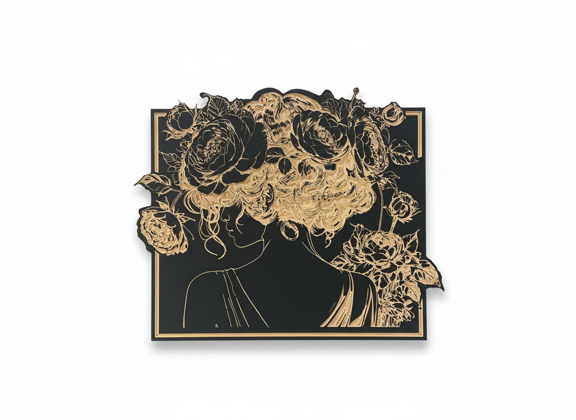Rose - Tendresse et mystère, douceur suspendue. Ce portrait féminin révèle une élégance délicate, accentuée par la présence subtile de roses gravées sur bois bouleau noir mat. Le relief naturel du bois fait ressortir les traits et les pétales avec finesse. Livré avec son système de fixation.