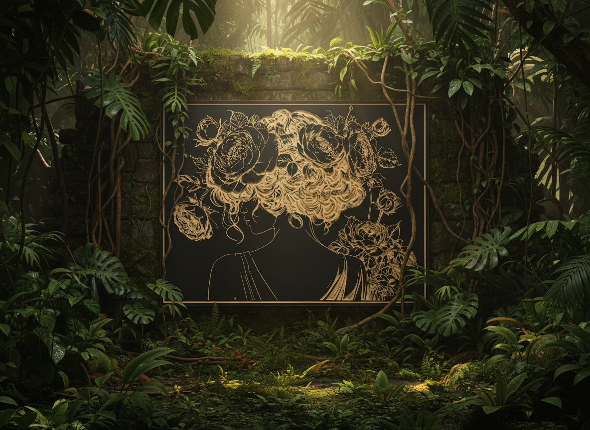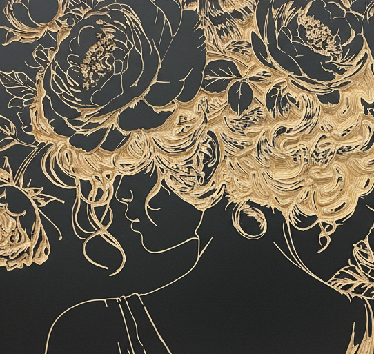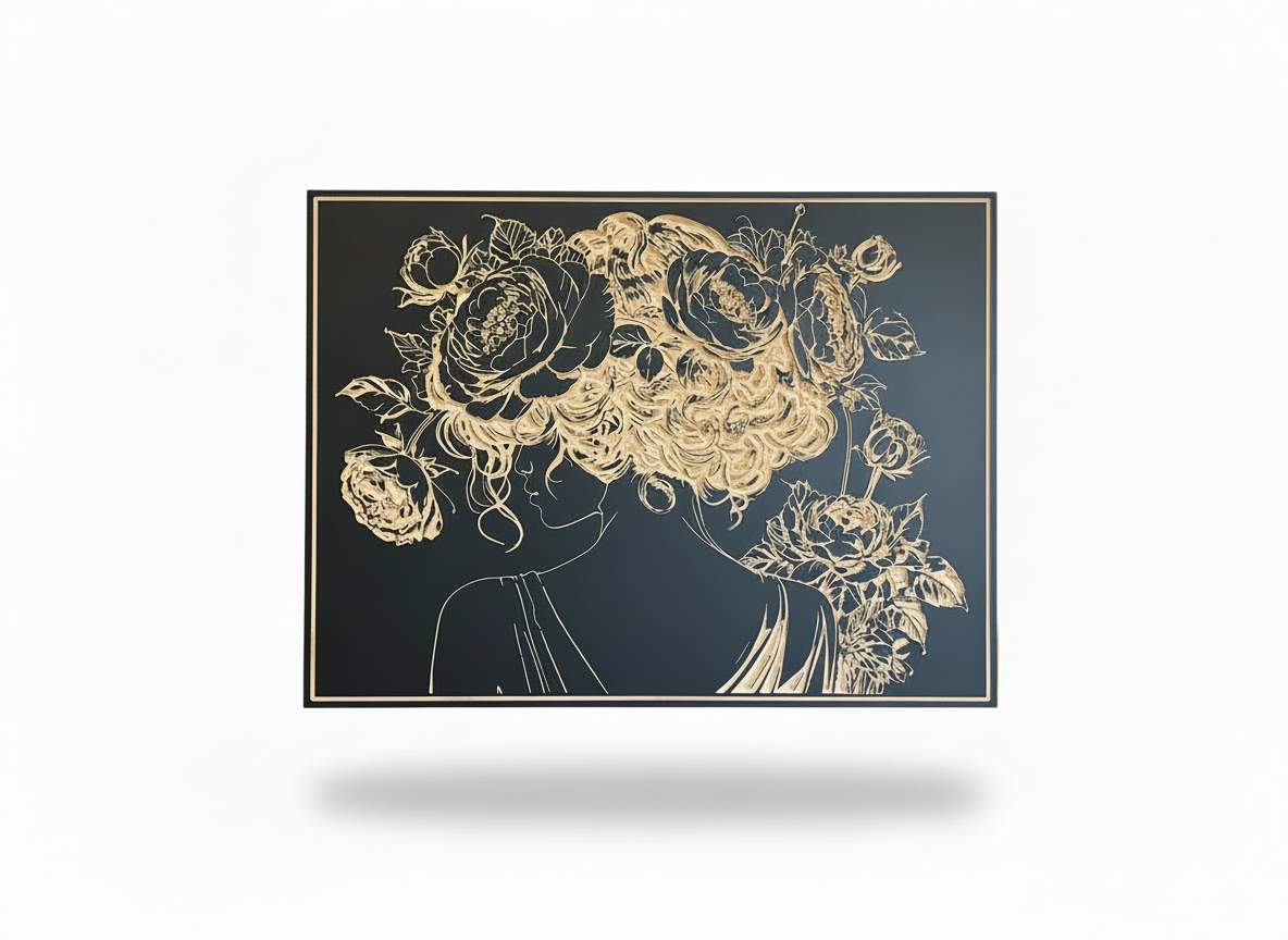 Rose - Tendresse et mystère, douceur suspendue. Ce portrait féminin révèle une élégance délicate, accentuée par la présence subtile de roses gravées sur bois bouleau noir mat. Le relief naturel du bois fait ressortir les traits et les pétales avec finesse. Livré avec son système de fixation.